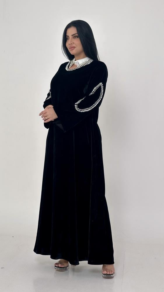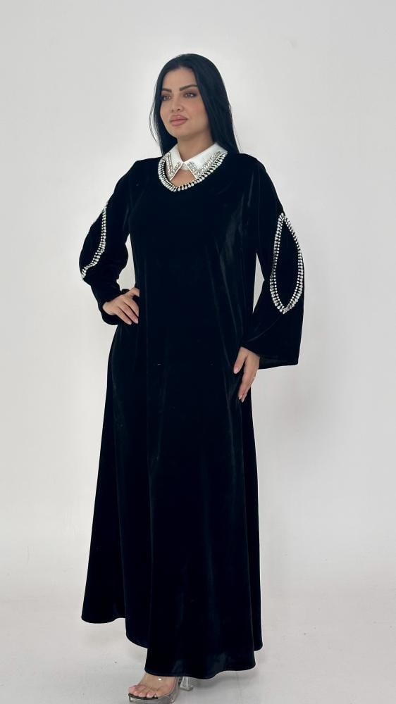جلابية مخمل اسود ستراس مع ياقه بيضاء